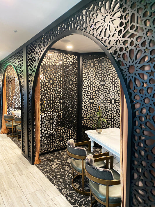 I pannelli traforati in stile arabo sono elementi decorativi che si ispirano ai tradizionali motivi geometrici e floreali dell'arte islamica. Questi pannelli, noti anche come mashrabiya, presentano intricati disegni simmetrici che creano giochi di luce e ombra, conferendo agli ambienti un'atmosfera esotica e raffinata.